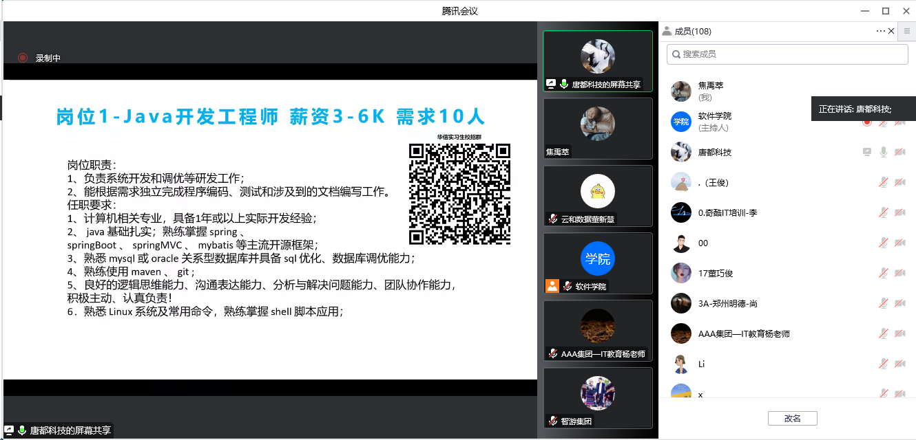 2022年11月9日下午,利用腾讯会议平台公司举行2023届毕业实习企业宣讲会。会议由公司校地合作负责人尹志学老师主持。参会人员有教师代表、公司2023届毕业生及河南奇酷网络工程有限公司、河南八六三软件股份有限公司、达内时代科技集团有限公司、北京千锋互联科技有限公司郑州分公司等12家企业。