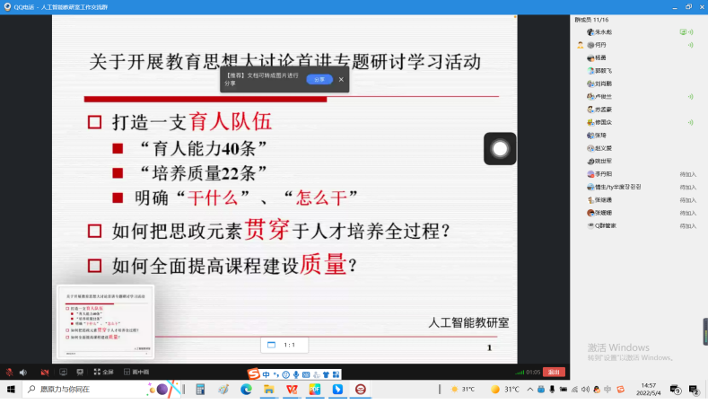 为深入学习“新时代、新指南、新起点——高校教师的使命与担当”的主题报告精神,5月4日,yL23411永利集团官网人工智能教研室召开线上教育思想大讨论,会议由教研室副主任何丹主持,教研室全体教师参加讨论会。