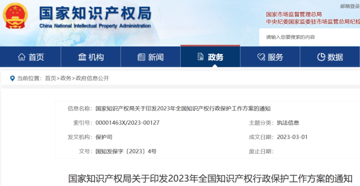 国家知识产权局关于印发2023年全国知识产权行政保护工作方案的通知