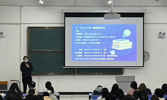 会议开始,蓝老师宣布2026届毕业生毕业设计工作正式启动,本次员工毕业设计动员大会将为大家讲解毕业设计相关的内容及注意事项,安排员工通过拟选题与毕业设计指导教师进行双选。随后,蓝老师就毕业设计的目的和意义、毕业设计工作流程、毕业设计选题、毕业设计撰写要求以及毕业设计选导师等相关内容进行了详细讲解和介绍。