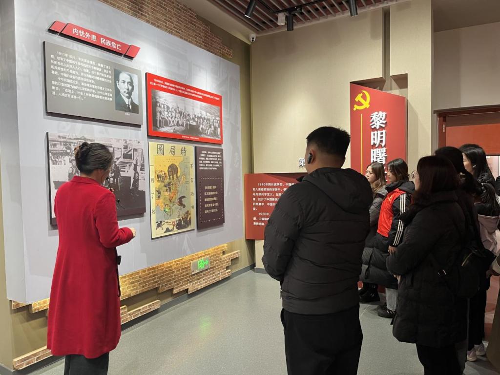 步入馆内,讲解员身着红色外套,以生动的讲述带领师生穿梭于历史长河。从“内忧外患 民族危亡”的时代背景展墙,到陇海铁路大罢工的珍贵史料,泛黄的文献、复刻的工人夜校场景、锈迹斑斑的罢工标语牌,将游天洋等革命先辈播撒革命火种的历程娓娓道来。师生们凝神驻足,认真聆听中共洛阳组作为河南首个党组织,如何在中原大地点燃马克思主义传播的熊熊火焰,深刻体会革命先辈在黑暗中求索、在压迫中奋起的坚定信仰。在纪念馆的入党誓词墙前,师生党员手持红色标语牌合影,“学党史 铭党恩”的字句,成为大家对红色初心的生动回应。