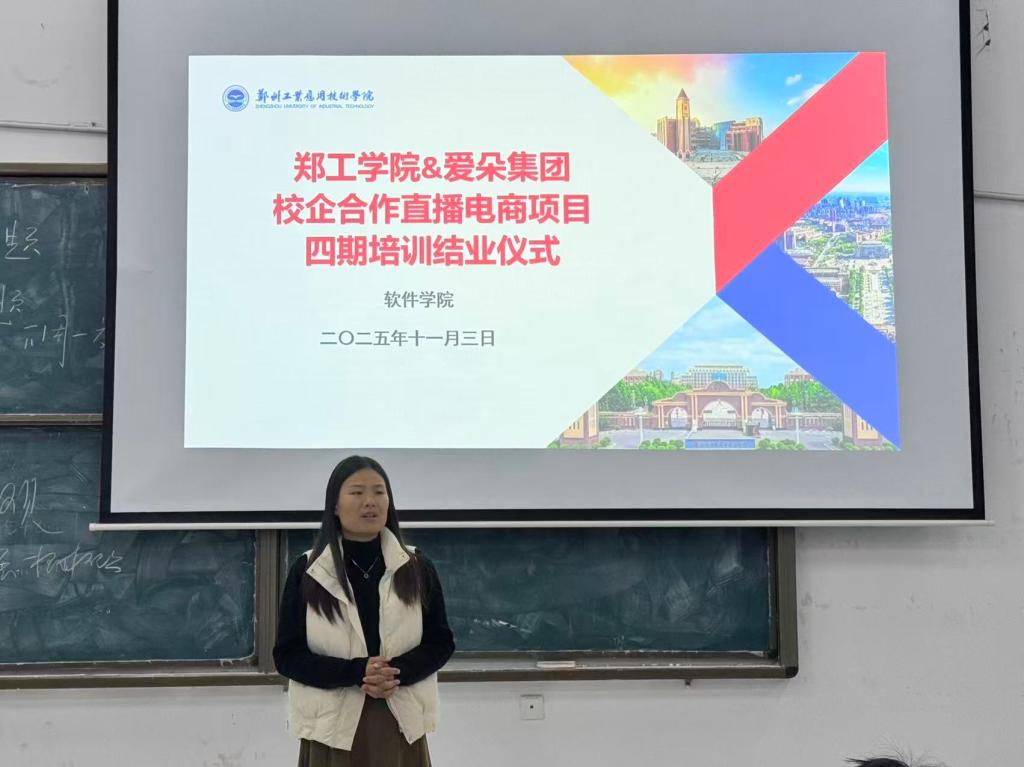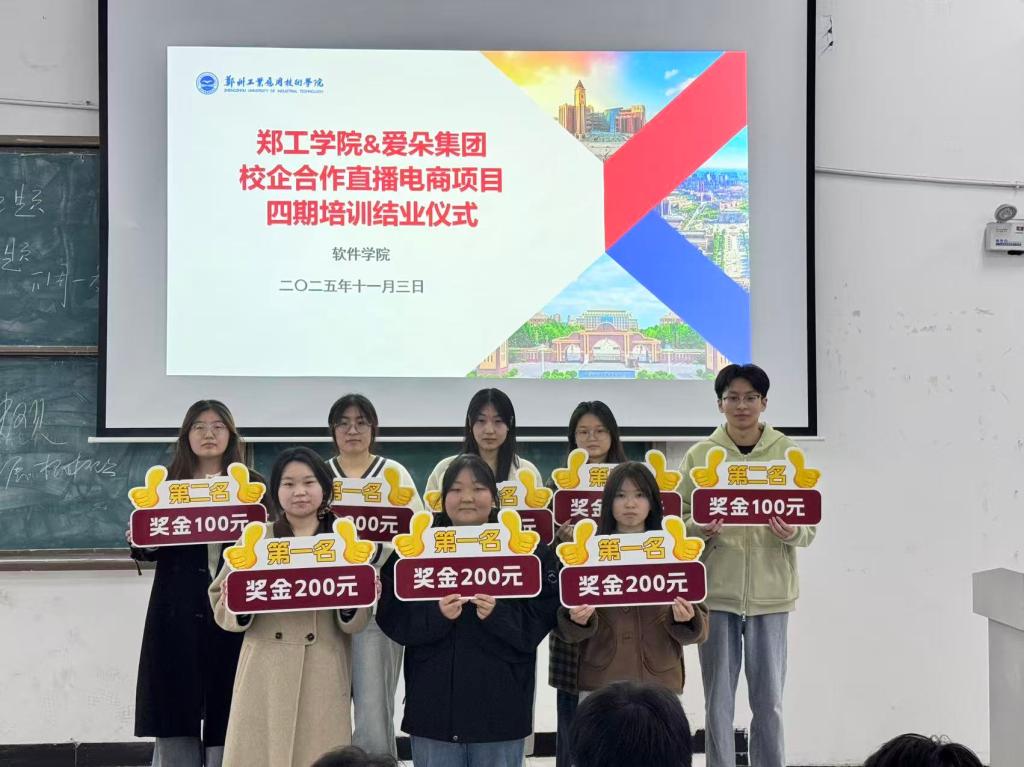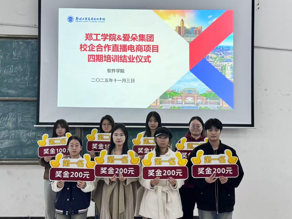 2025年11月3日18时,公司与爱朵集团联合打造的直播电商项目四期培训结业仪式,在信科二阶3教室顺利举行。公司副经理张莎、校内指导老师袁晓贞,爱朵集团企业导师蛋蛋、楚自豪,以及四期全体参训学员齐聚现场,共同见证这一时刻。
