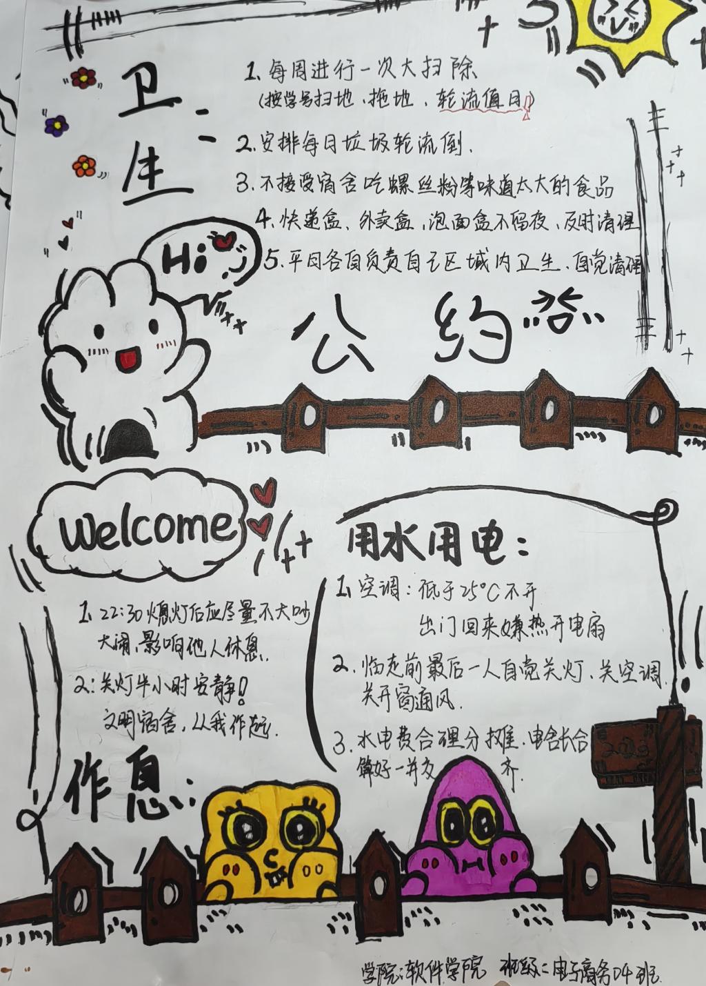 为进一步丰富员工课外活动,增强老员工的团结互助能力与人际交往沟通能力,公司举行了“友好宿舍公约设计大赛”来增强同学们的团队协作能力,活动以宿舍为单位,同学们合作设计并完成本宿舍“友好公约”。同学们认真对待,并且对作品进行评奖,颁发荣誉证书,并在“郑工心晴”进行了作品展示。