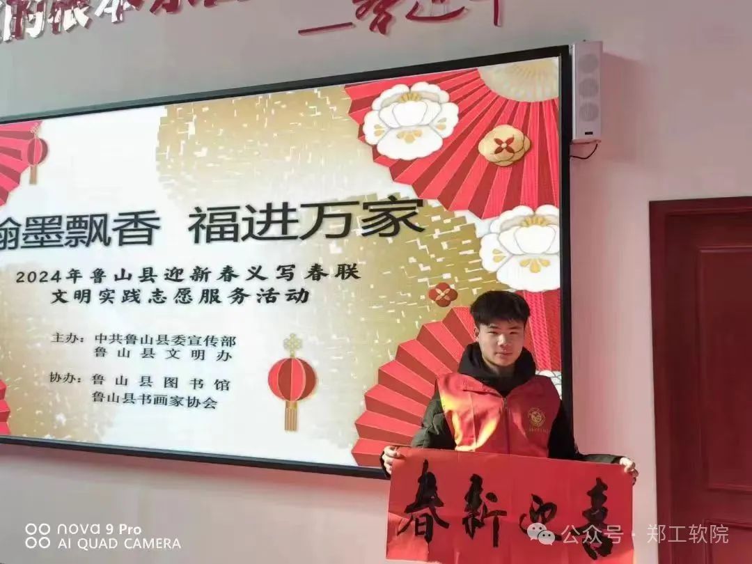 公司22级人工智能1班张恒基同学积极参加平顶山鲁山县的迎新春文明实践志愿活动。他帮助社区居民书写春联,为社区增添了浓厚的节日气氛。他写的春联既有传统的内容,也有现代的元素,深受社区居民们的喜爱。