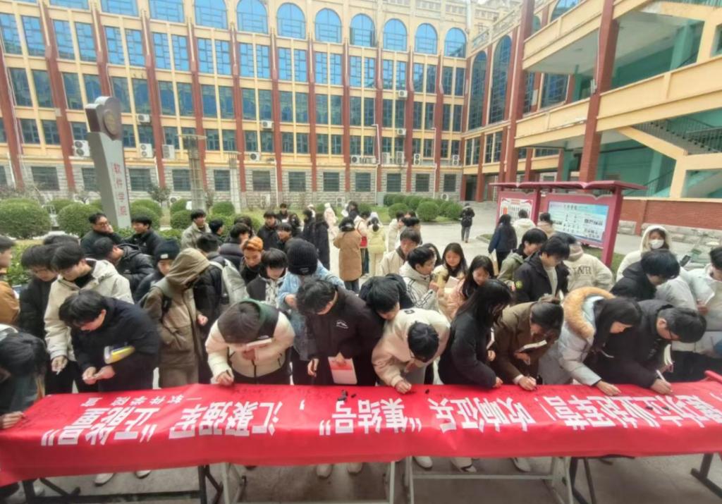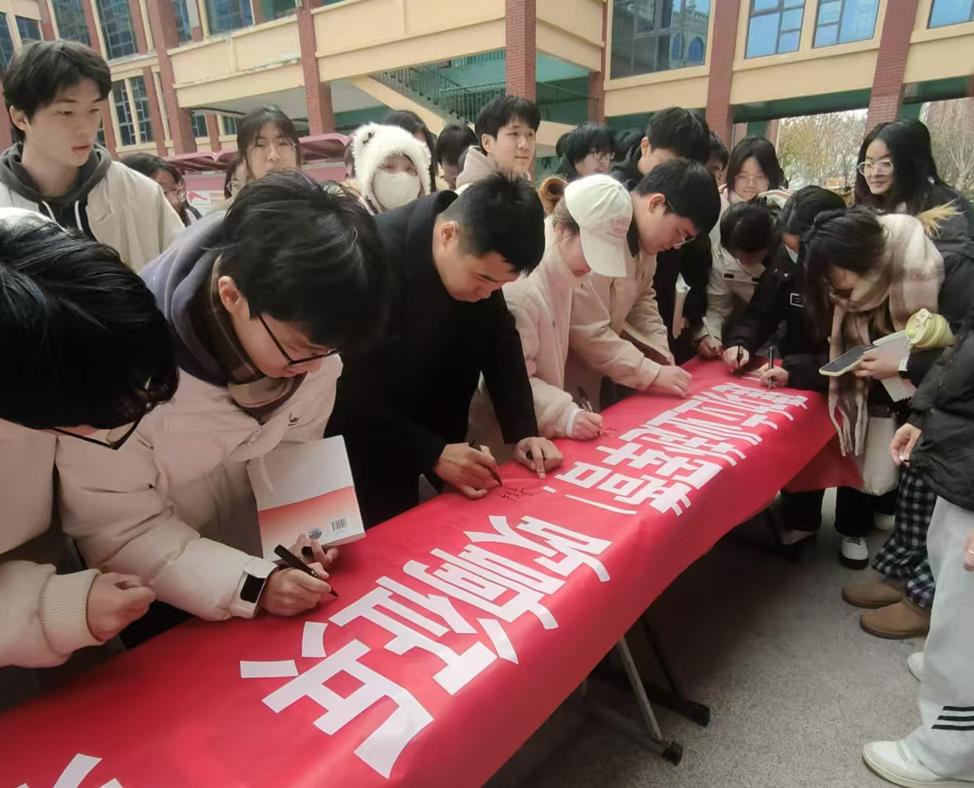 现场气氛热烈而凝重,红色的横幅上 “响应征兵号召,投身强军伟业” 几个大字在阳光的照耀下熠熠生辉,仿佛在诉说着青年学子们的使命与担当。同学们怀着对军旅生活的崇敬与向往,井然有序地来到横幅前,郑重地拿起笔,签下自己的名字。每一个签名都力透纸背,饱含着他们对祖国的热爱和保家卫国的坚定决心。这不仅仅是简单的签字,更是一份庄严的承诺,象征着青年学子们愿意将自己的青春韶华与热血激情融入到国防建设的伟大征程中,为实现强军梦奉献自己的力量,开启属于他们的军旅篇章。