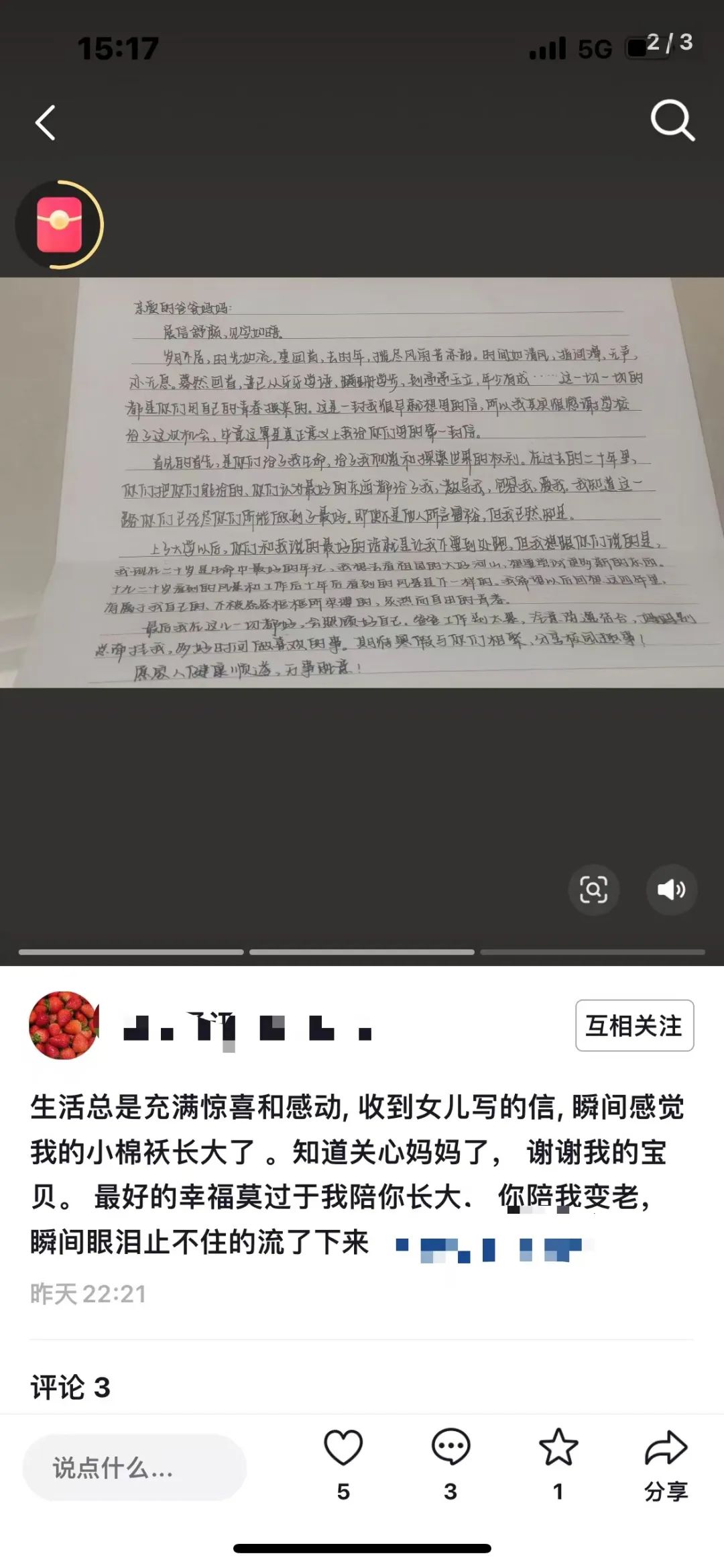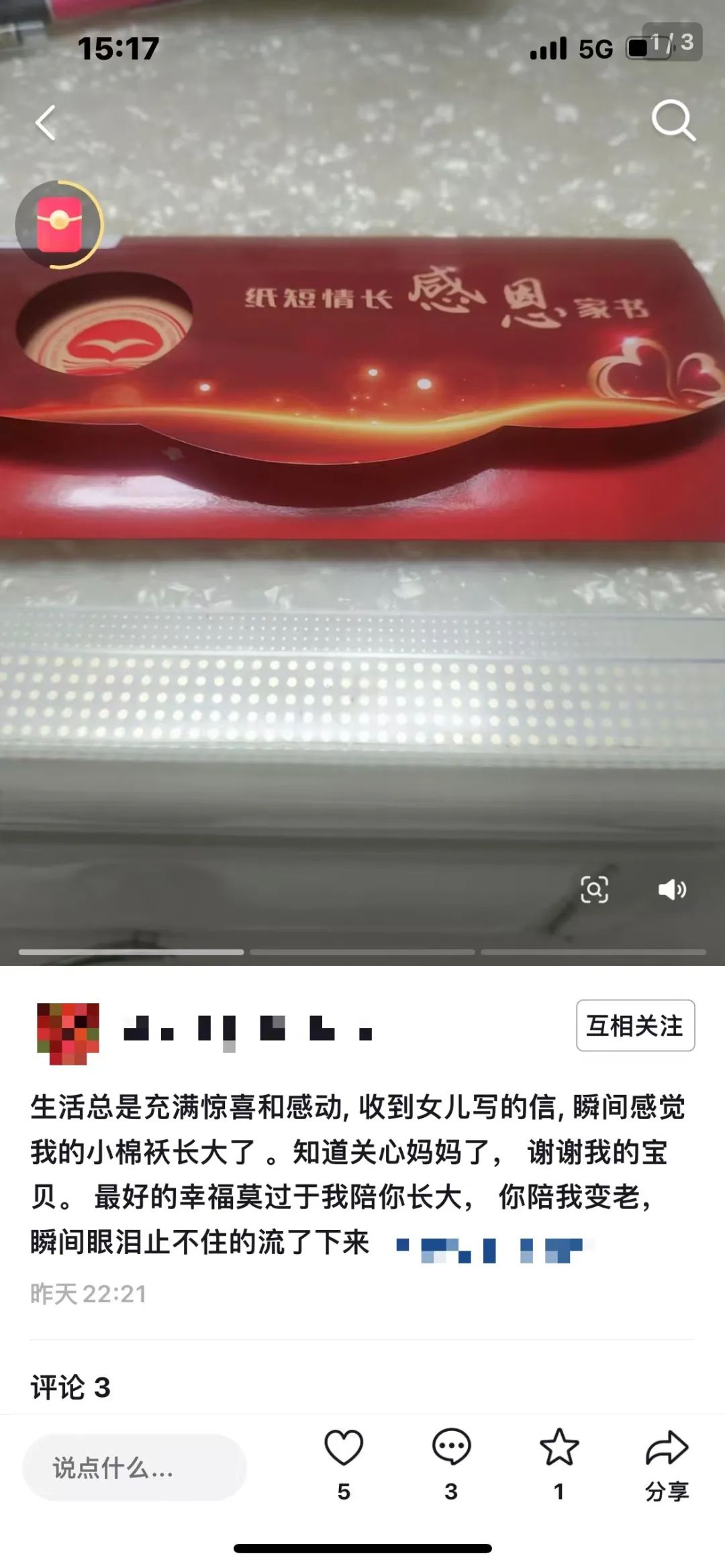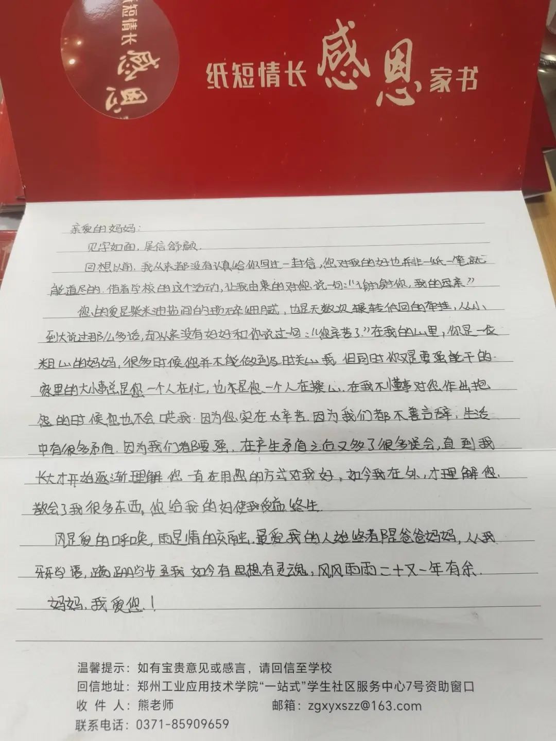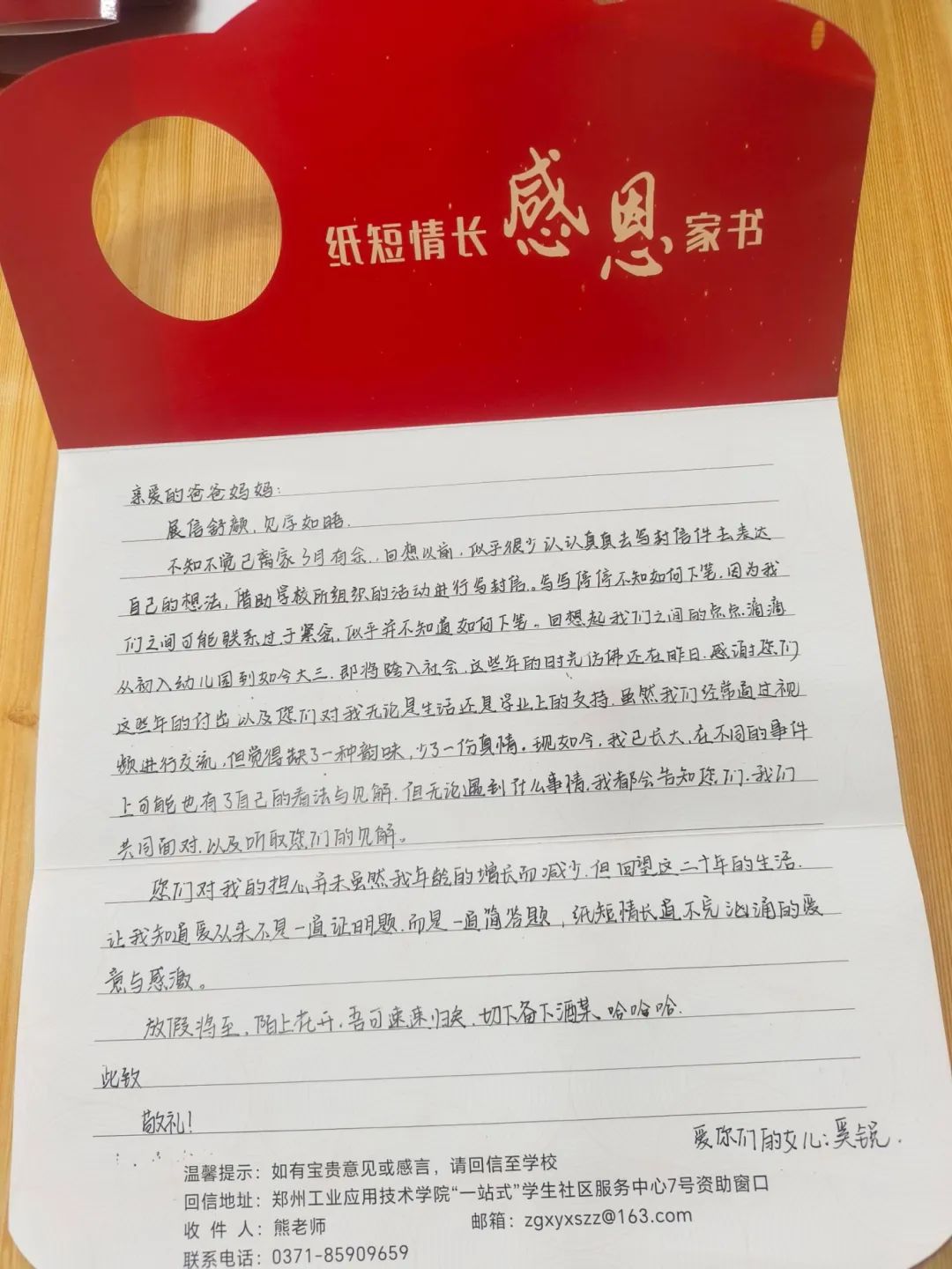 活动旨在引导员工们通过书信的形式,向自己的父母表达内心深处的感激之情。活动不仅加深了亲子间的情感交流,还涌现出了一批感人至深的优秀家书,成为校园内外传颂的佳话。活动自启动以来,得到了全校师生的积极响应。员工们利用课余时间,精心构思,字里行间流露着对父母的养育之恩、无私奉献的深深感激。有的家书回忆了与父母共度的温馨时光,有的则表达了对父母辛劳的理解与心疼,更有员工以未来规划为笔,承诺将以实际行动回报父母的期望与付出。