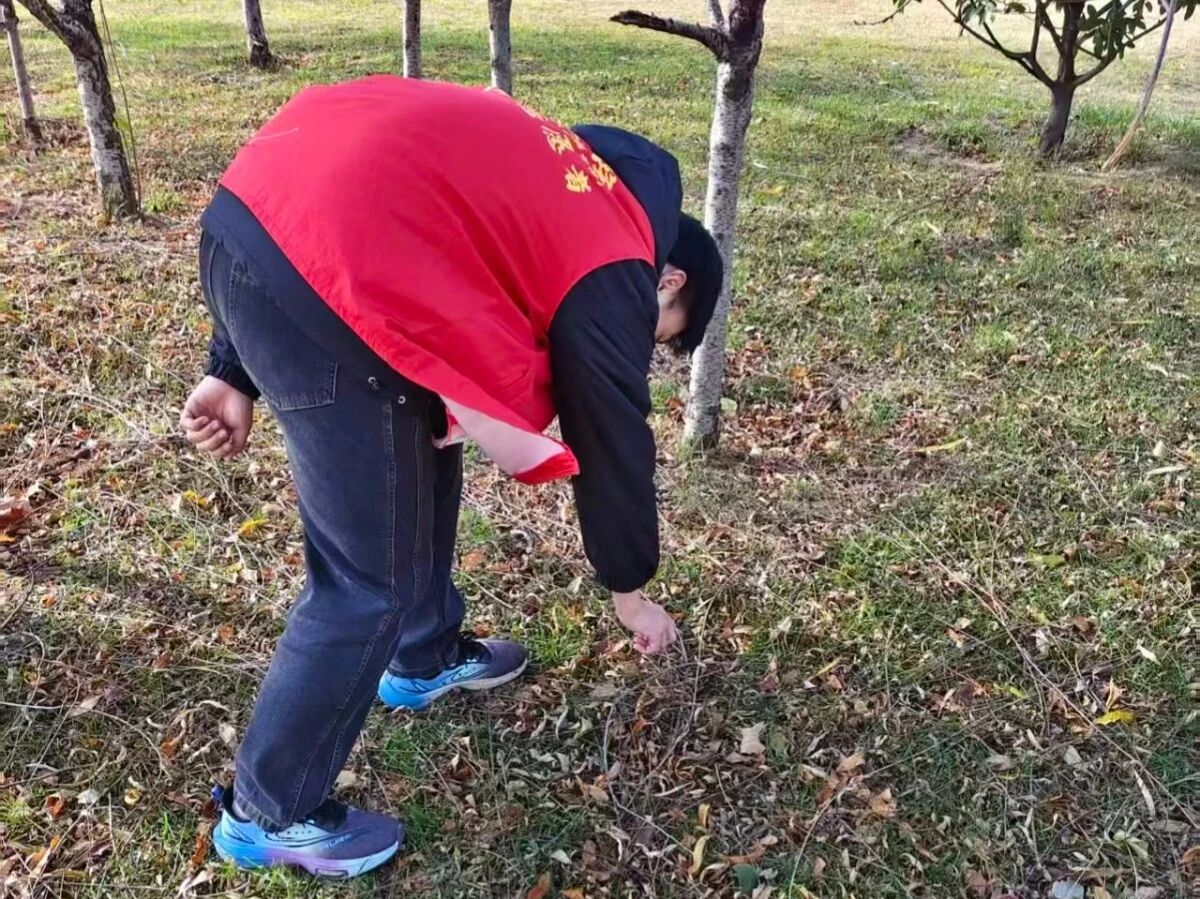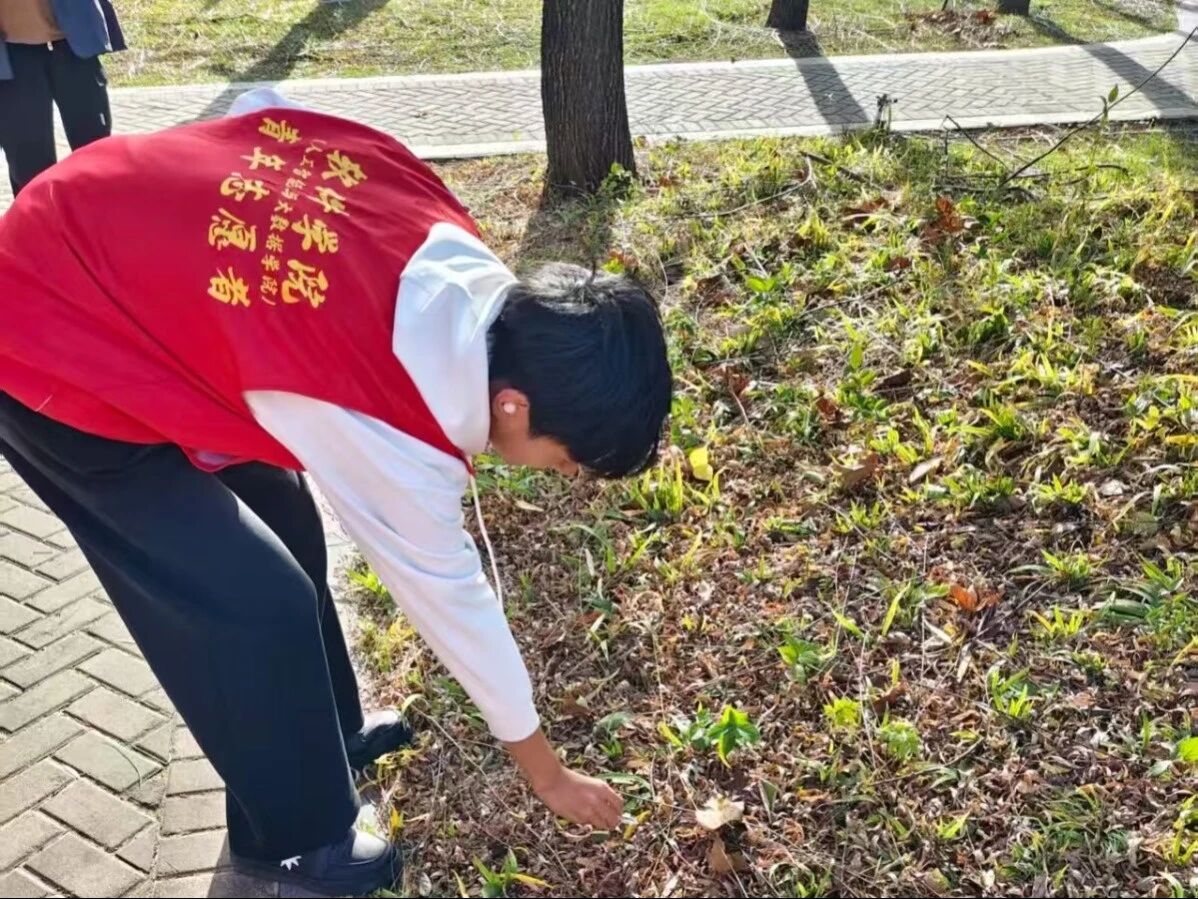 活动现场分为“自然探索”与“生态守护”两大环节。在自然探索环节,同学们识别园区内的植物与鸟类,用放大镜观察叶片纹理、记录鸟类活动轨迹,在沉浸式体验中解锁自然奥秘;进入生态守护环节,同学们手持分类垃圾袋、长柄夹,重点清理草坪、湖边及步道旁的塑料瓶、零食包装袋等垃圾,并现场学习可回收物、有害垃圾的分类标准,将清理的垃圾精准投放到对应回收箱。尽管户外寒风微凉,但同学们的探索热情与环保行动力丝毫未减,每发现一种新植物、每清理一片垃圾,都成为大家共同的“自然趣事”。